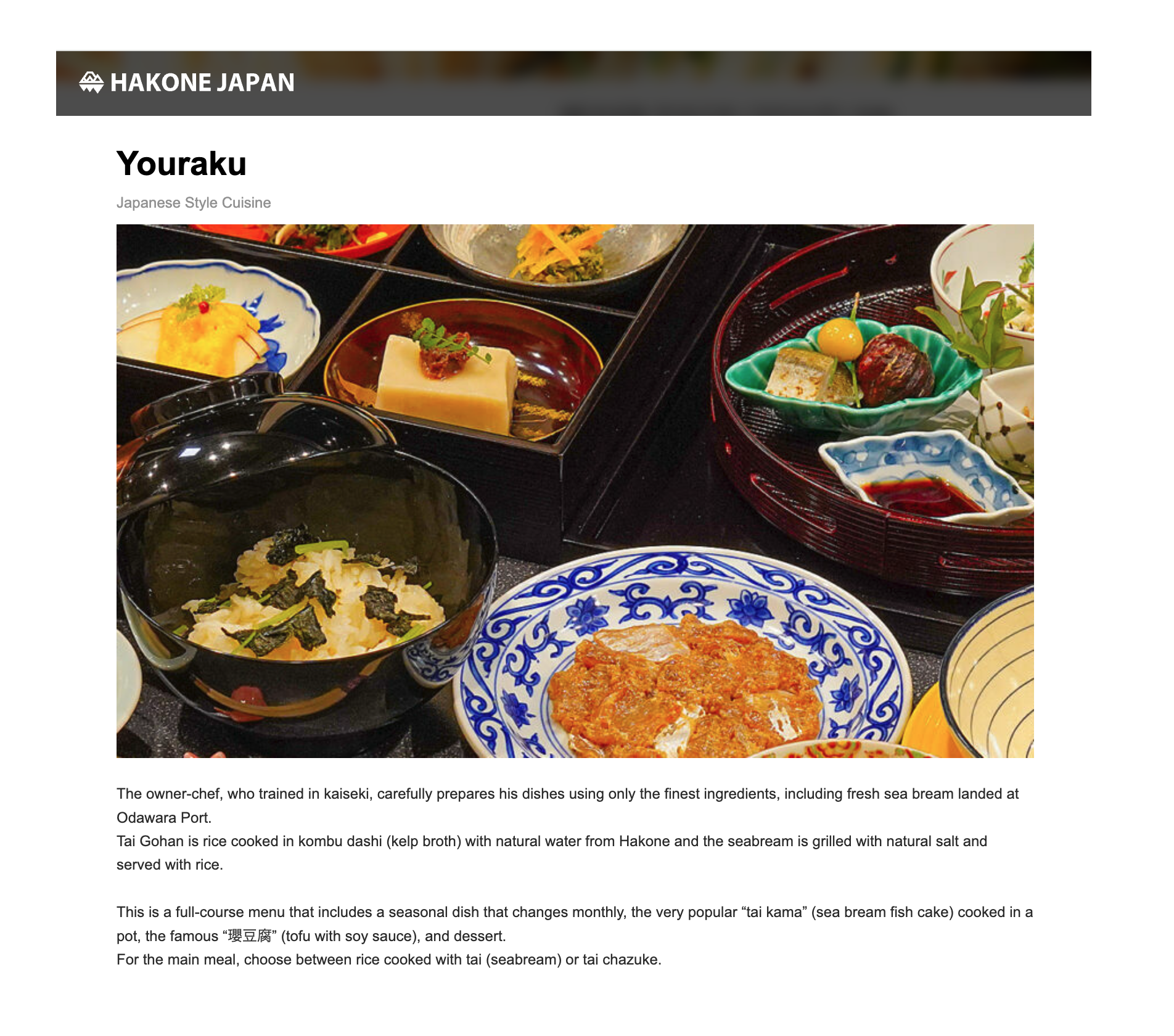 Tai gohan YOURAKU, established in 1992, is located along the Hayakawa River, Tounosawa hot spring area, Hakone. Tounosawa hot spring is known as its high quality of onsen water and said to be good for the treatment of neuralgia, arthralgia and poor blood circulation. Tounosawa hot spring has been welcoming many tourist and people staying at a spa to cure a disease for a long time. We are surrounded by beautiful nature, so you can enjoy cherry blossoms in Spring, feel comfortable breeze in summmer, see colorful leaves of maple trees in Autumn and quiet scenery or falling snow from windows in winter.