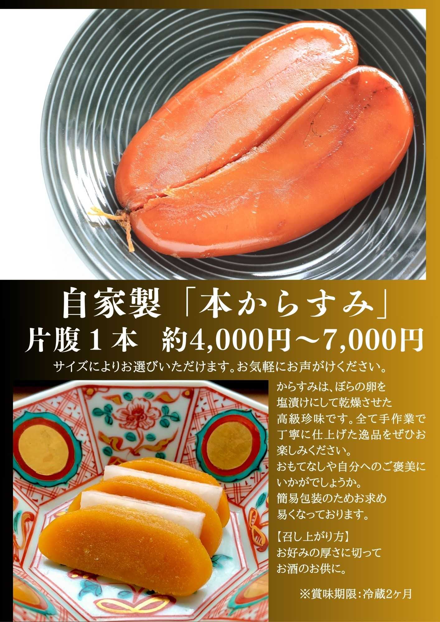 希少な国産ぼらの卵を、全て手作業で丁寧に仕上げた逸品をぜひお楽しみください。