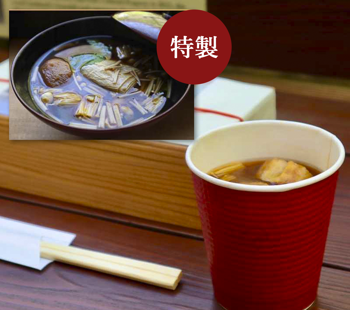 店内でお出ししているものと同じ赤だしを紙コップに入れてご提供します。